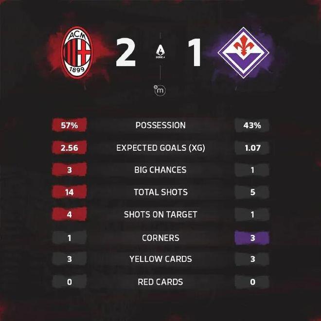 全场比赛结束,米兰主场2-1逆转佛罗伦萨。